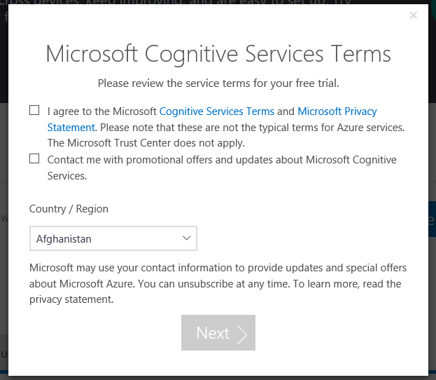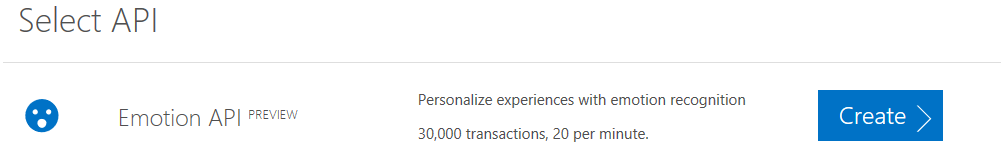 To get starded we need to get an API key to be able to access the Cognitive Services. So, let’s go to this address (https://azure.microsoft.com/en-us/try/cognitive-services/?api=emotion-api) and click on the Create button next to Emotion API.
