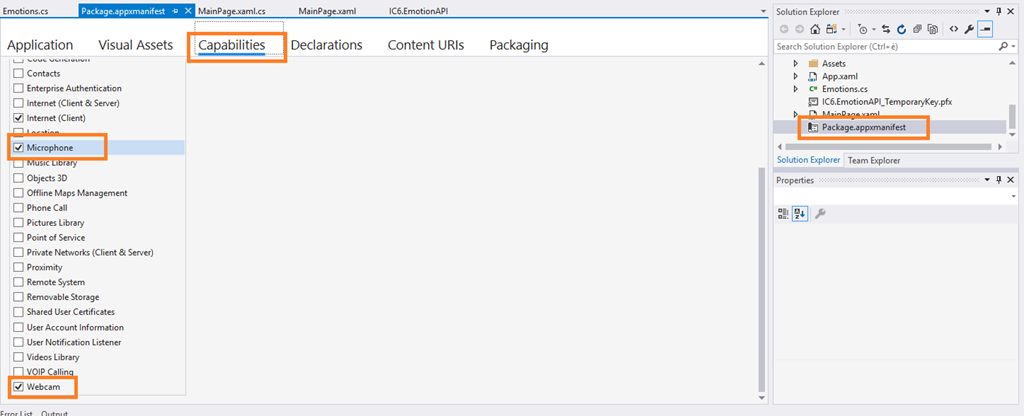 Before we write code we need to setup our application capabilities in the manifest and download some NuGet packages. We double click on the Package.appxmanifest file in Solution Explorer and Visual Studio, go to the Capabilities tab and check the webcam and microphone boxes.