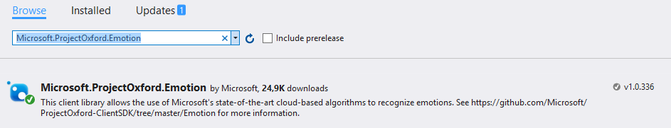 Then we download the Microsoft.ProjectOxford.Emotion NuGet package that contains some helper classes to deal with the Azure Cognitive Services. In the Solution Explorer we right click and select Manage NuGet Packages. In the search box we type “Microsoft.ProjectOxford.Emotion”. We download the package.