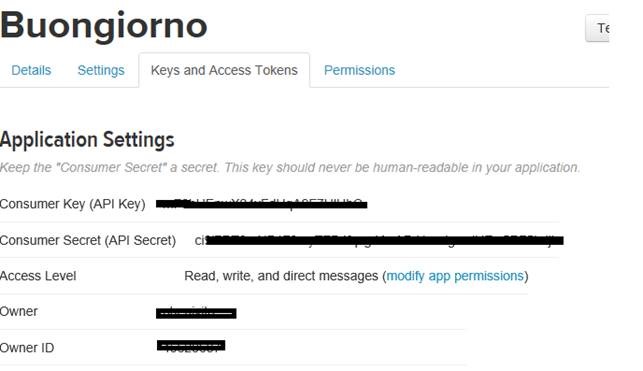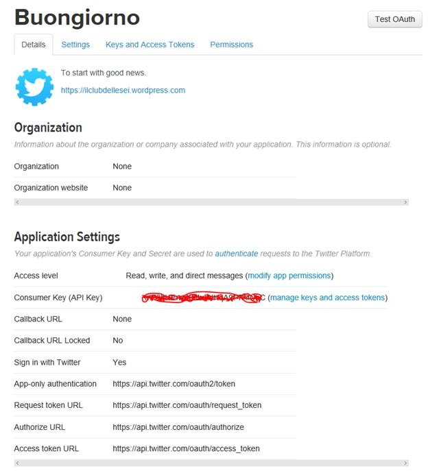 If the process completes successfully we can manage our application settings in a page that looks like this (my app is called Buongiorno):