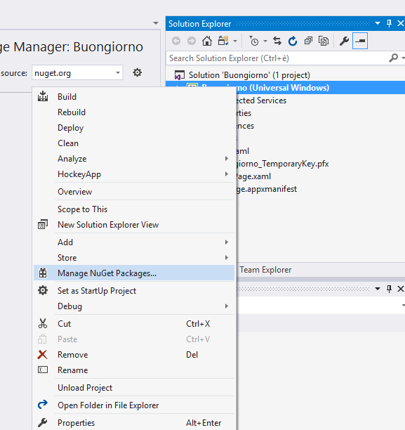 The next thing to do is to import the Linq2Twitter library available as a NuGet package. Right-click on the project in the Solution Explorer and click Manage NuGet Packages.