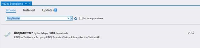 Next we search for “Linq2Twitter” in the browse section and download the package with the download arrow icon on the right.