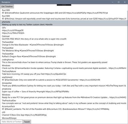 In this post we learned how to do a simple custom Twitter client that reads our timeline and can write tweets. The main points were to register our app in the Twitter Developer portal, leverage the Linq2Twitter API to do the OAuth authentication and save the tokens in the local storage and make calls to Linq2Twitter API to search for timeline and to tweet. If you want to learn more, you can refer to the GitHub project of Linq2Twitter (https://github.com/JoeMayo/LinqToTwitter) and the Twitter API official documentation (https://dev.twitter.com/docs). The source code of this example is available on my GitHub (https://github.com/phenixita/uwp-simpletwitter). If you liked this post please share!