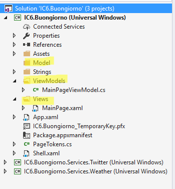 I converted the Universal app to a Prism Universal app by configuring the bootstrapper. The bootstrapper is a required procedure by the Prism framework to properly initialize all the infrastructure. In vanilla UWP, the bootstrapper is the App class. I edited the App class so that it doesn’t inherit from the native Application class but from a Prism class called PrismUnityApplication. This is the full App.xaml file. [code language=“xml”] <prismUnity:PrismUnityApplication x:Class=“IC6.Buongiorno.App” xmlns=“http://schemas.microsoft.com/winfx/2006/xaml/presentation” xmlns:x=“http://schemas.microsoft.com/winfx/2006/xaml” xmlns:prismUnity=“using:Prism.Unity.Windows” RequestedTheme=“Light”> </prismUnity:PrismUnityApplication> [/code] This is the full App.xaml.cs file. [code language=“csharp”] using System.Threading.Tasks; using Microsoft.Practices.Unity; using Prism.Unity.Windows; using Prism.Windows.AppModel; using Windows.ApplicationModel.Activation; using Windows.ApplicationModel.Resources; using Windows.UI.Xaml; using Windows.UI.Xaml.Controls; using IC6.Buongiorno.Services.Twitter; using IC6.Buongiorno.Services.Weather; namespace IC6.Buongiorno { ///