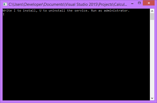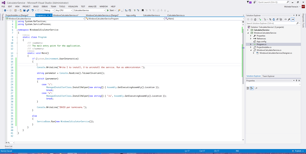 - Sostituisco il metodo Main() di Program.cs del progetto WindowsCalculatorService con queste righe di codice per permettere l’installazione semplicemente avviando l’exe e digitando una lettera: I installa, U disinstalla.