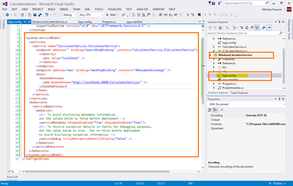 - Per far sì che il servizio WCF sia correttamente configurato quando ospitato dal servizio Windows bisogna riportare la configurazione dal file App.config del progetto WCF a quello del servizio di Windows. Attenzione! Riportare solo la sezione <system.serviceModel>!