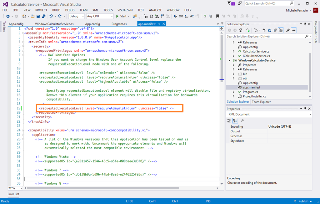 - Per permettere l’installazione del servizio di Windows è necessario avere privilegi di amministratore quindi aggiungendo un file manifest alla soluzione WindowsCalculatorService (add item –> manifest file) vado a specificare level=requireAdministrator nell’apposita sezione del file.