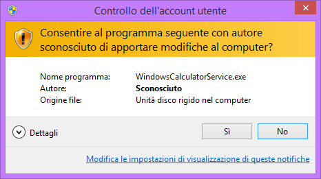 - Compilo e avvio WindowsCalculatorService.exe e il sistema operativo propone l’UAC come giusto che sia.