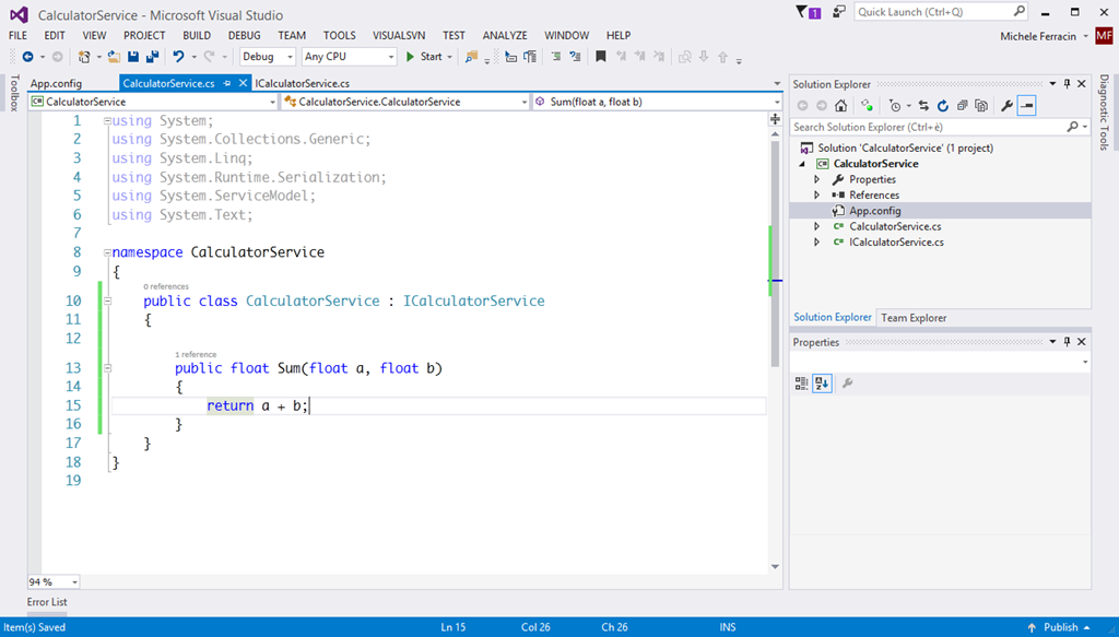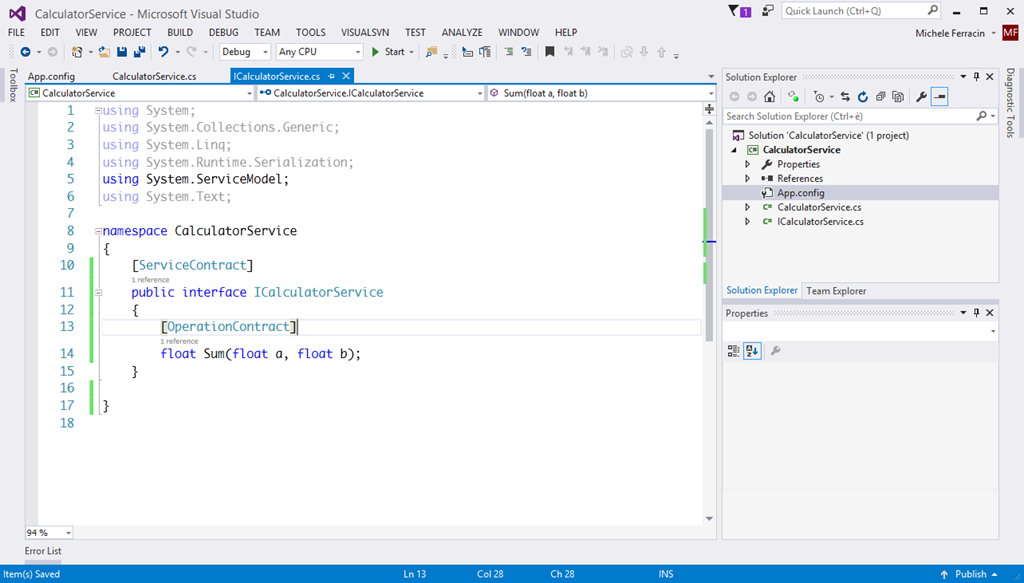 - Ho rinominato con F2 i nomi dei file del progetto standard e del servizio che volevo implementare. Ho chiamato l’interfaccia ICalculatorService e la classe che lo implementa CalculatorService. Il servizio espone una funzionalità di somma di numeri con virgola.