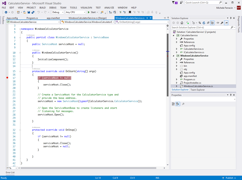 - Modifico il WindowsCalculatorService.cs affinché quando viene avviato esegua il necessario per ospitare il nostro servizio WCF CalculatorService.