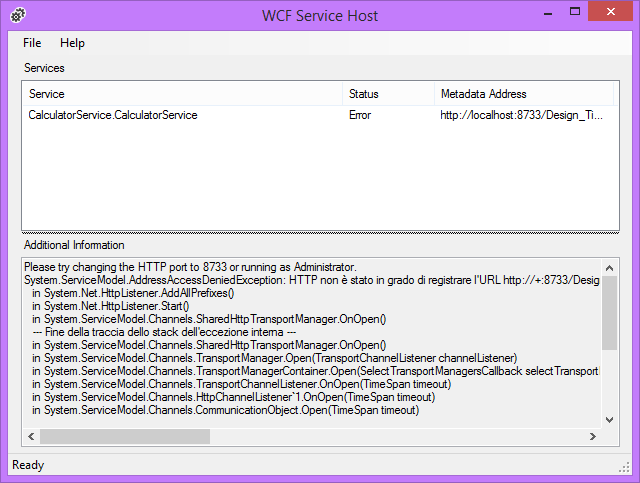 - Ho eseguito il progetto (F5) e mi sono imbattuto subito in un problema: AddressAccessDeniedException. Cercando su MSDN e StackOverflow ho capito che è un problema di privilegi. Per registrare un endpoint di ascolto bisogna avere permessi di amministratore.