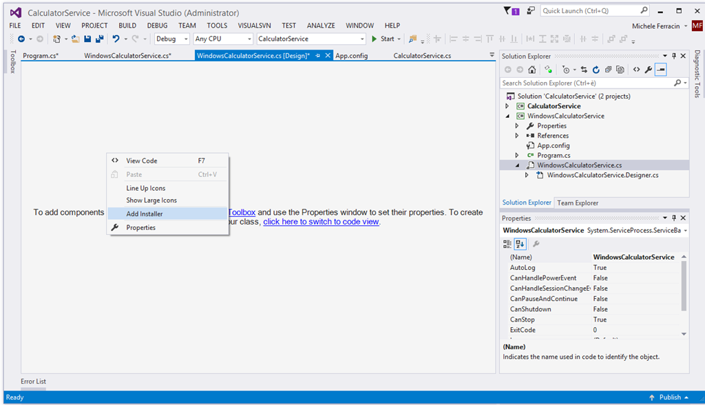 - Aggiungo al progetto un installer per facilitare il lavoro di installazione del servizio. Clic destro, Add Installer.