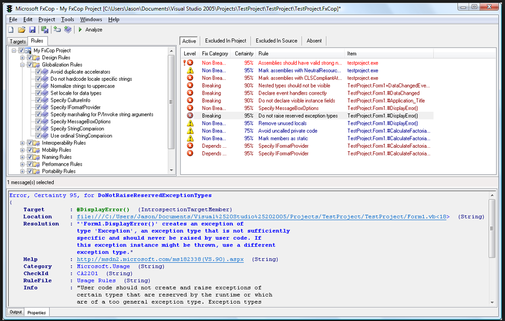 FxCop nasce come progetto interno di Microsoft per verificare l’adesione alle .NET Framework Design Guidelines del codice che viene scritto ogni giorno. Analizza il CIL degli assemblies alla ricerca di più di 200 possibili “violazioni” raggruppate in: