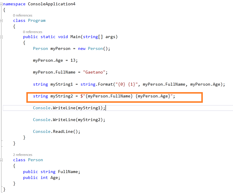 Fantastico! Inoltre Visual Studio riconosce gli oggetti dentro le graffe in tutto e per tutto quindi anche nelle procedure di refactoring con F2. Il risultato è ovviamente questo: