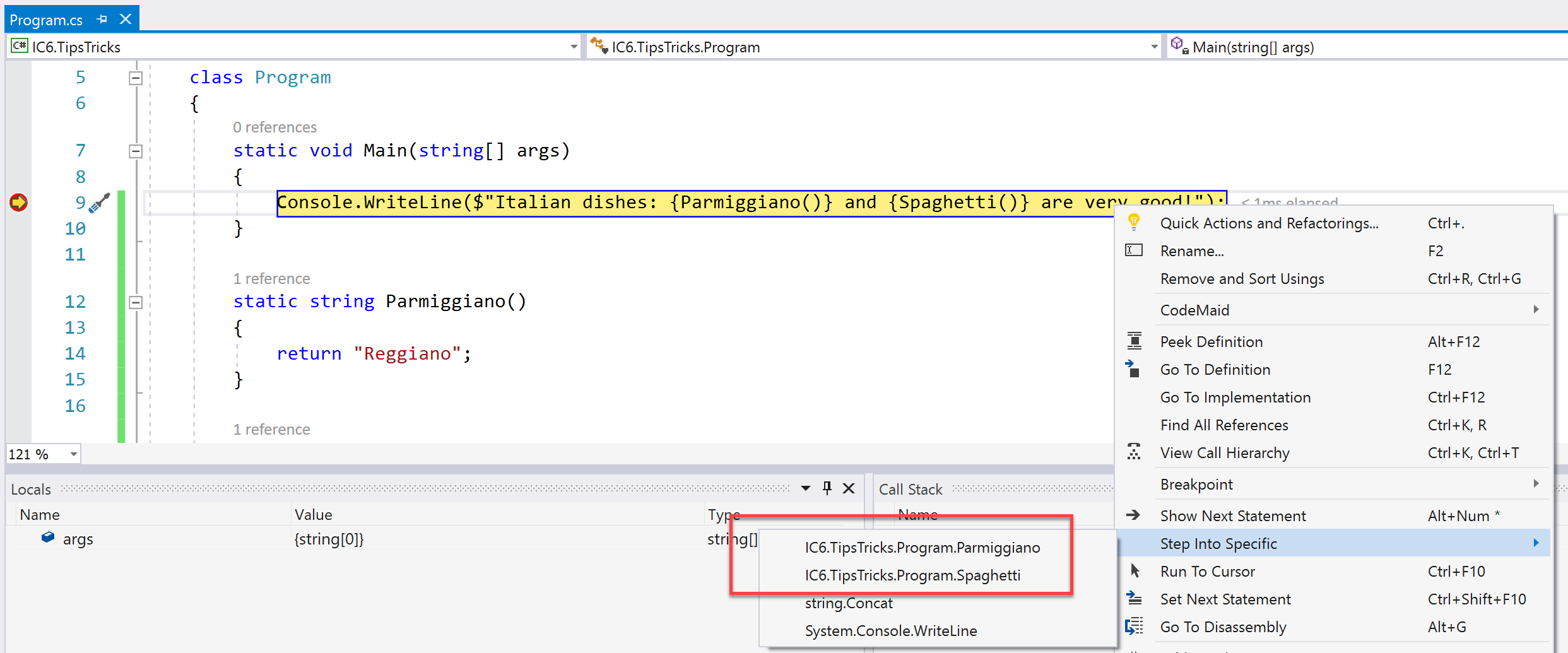 This feature is helpful when we have a situation like below. We set a breakpoint in line 9 and when the program counter hits that point. Now we would like to jump directly into Spagetti() without stepping into Parmiggiano(). To do so we right-click the program-counter line, Step Into Specific and then Spaghetti().