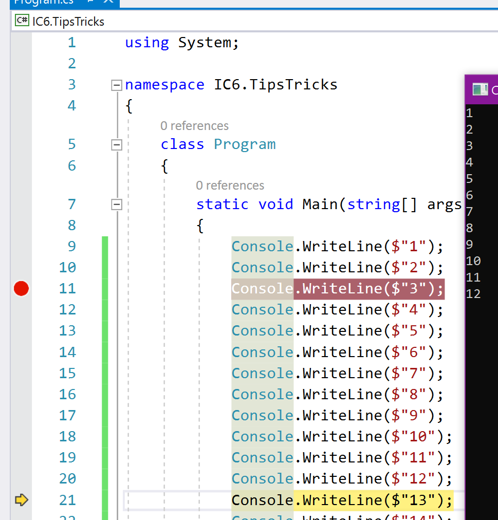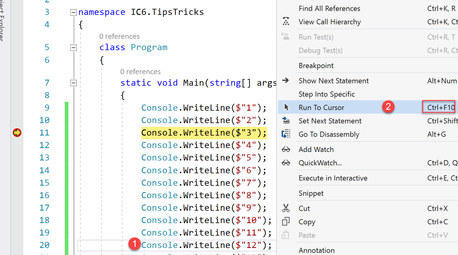 If we have a situation like the following picture we may want to run to line 20 without stepping-over (F10) many times. With Run To Cursor we can run to the statement where our cursors is located and stop there. We can do this with right click, Run To Cursor or with the CTRL+F10 keyboard shortcut.