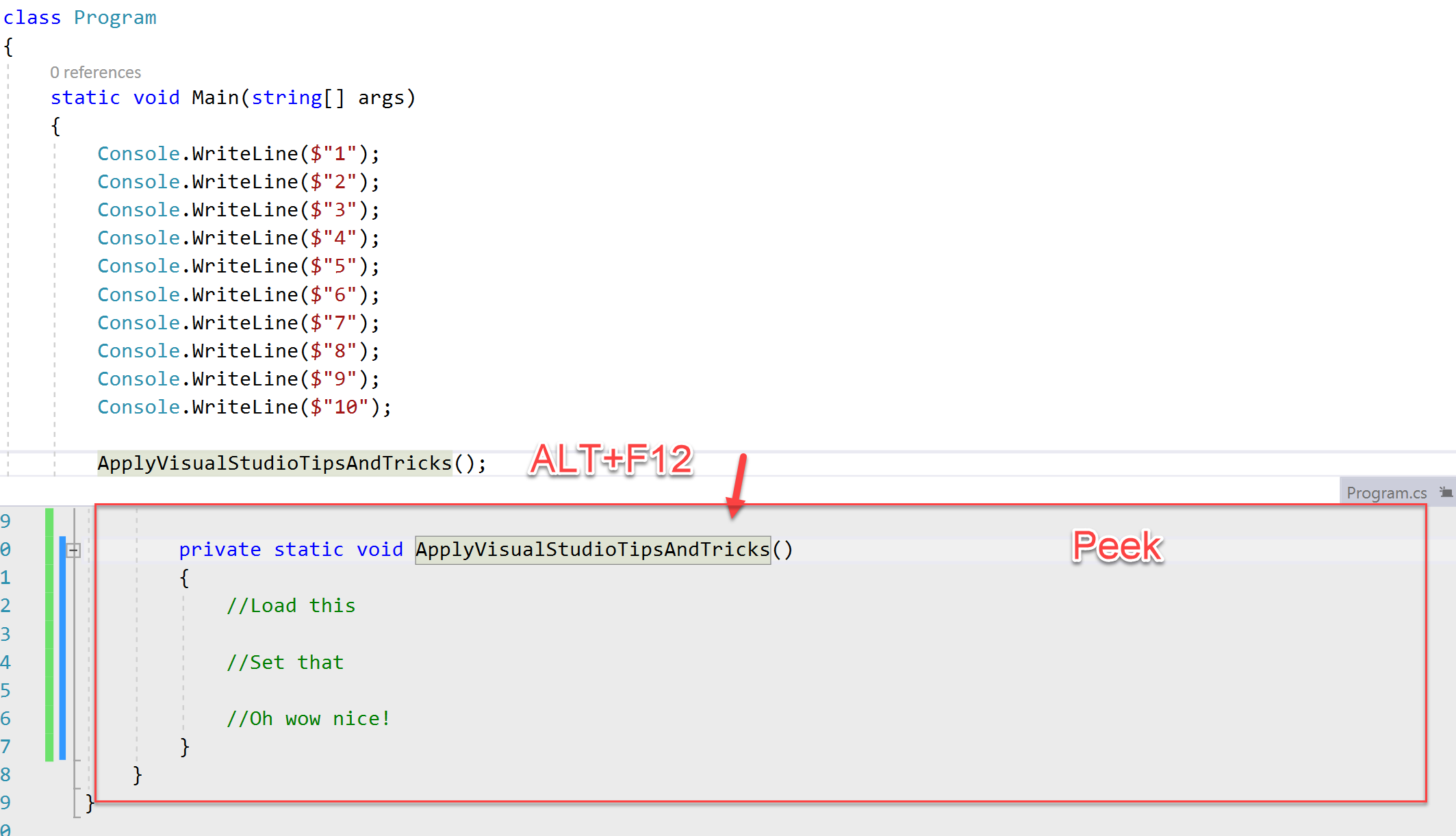 If we want to look quickly without changing context to a definition of a method or class we can use the ALT+F12 keyboard shortcut. It opens a frame inside our current code to show details of what we selected.